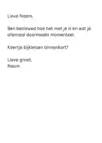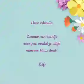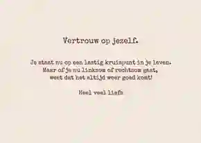 Wil je graag toch iets meer erop zetten? Kies dan voor woorden die passen bij wie je bent. Vertel bijvoorbeeld wat het met je doet dat je hem/haar verdriet ziet hebben. En als je zomaar een kaartje stuurt, vertel dan bijvoorbeeld een leuke anekdote of een verhaal wat je laatst hebt meegemaakt. Stuur je een denken aan kaart omdat je iemand succes wilt wensen? Schrijf dan bijvoorbeeld in de kaart “Ik denk aan je omdat je morgen een examen moet doen, weet dat ik altijd in je heb geloofd. Als iemand het kan, dan ben jij het.”