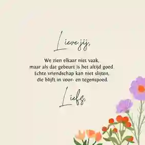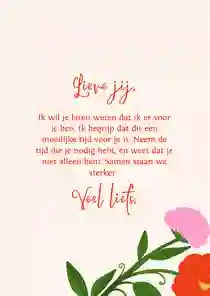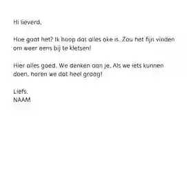 Woorden zijn vaak mooi in hun eenvoud. Het belangrijkste is dat ze uit een oprecht hart komen. Je kunt natuurlijk altijd de reden noemen dat je het kaartje stuurt. Bijvoorbeeld: “Ik denk aan je vanwege je ziekenhuisopname” of “Ik denk aan je in deze moeilijke tijd”. Veel meer hoeft het niet te zijn, de kaart zelf is al een prachtig gebaar.