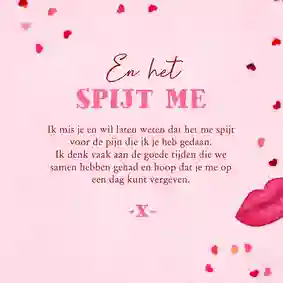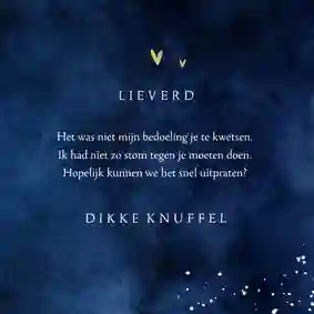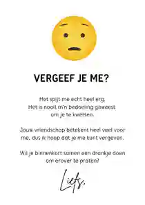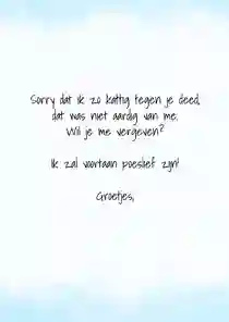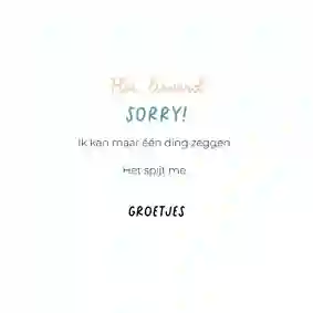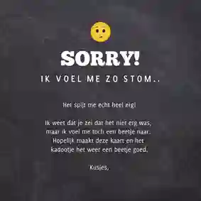 Heb je per ongeluk een deuk gereden in de auto van je moeder, iets kwetsends gezegd tegen je beste vriend(in) of ben je een etentje met een oud-klasgenoot vergeten? Een foutje is zo gemaakt. Gelukkig is het nooit te laat om sorry te zeggen en het goed te maken. Verstuur daarom een sorry kaart met een persoonlijke boodschap om te laten weten dat het je spijt.