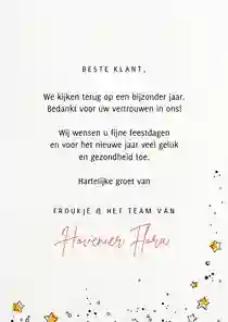 Veel bedrijven kiezen voor een korte en vriendelijke kerstwens, zoals een dankwoord, een vooruitblik op het nieuwe jaar of een persoonlijke boodschap voor de ontvanger. In ons artikel Wat schrijf je op een zakelijke kerstkaart vind je handige voorbeelden van zakelijke kerstwensen en kerstgroeten.