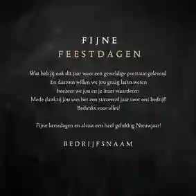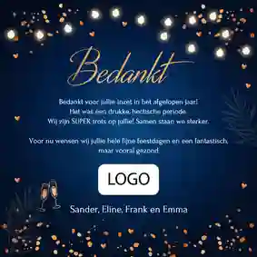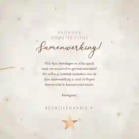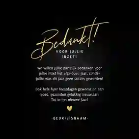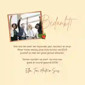 Bedankt voor de fijne samenwerking in [jaartal]. Wij wensen je warme feestdagen en een succesvol nieuwjaar.