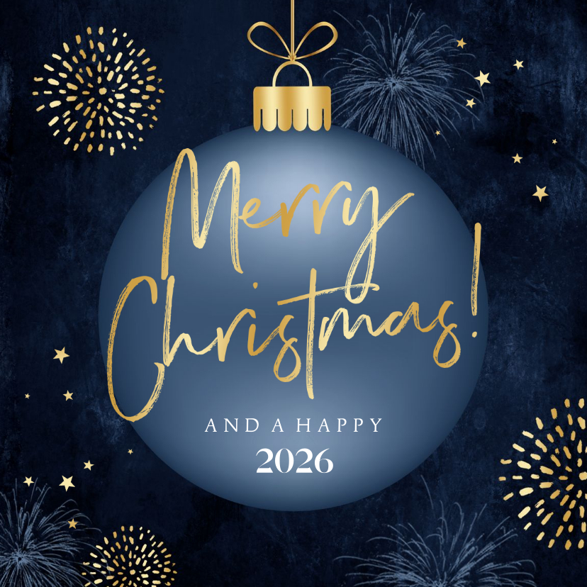 Een stijlvolle en hippe zakelijke kerstkaart met blauwe kerstbal en gouden sterren met vuurwerk. Leuk met eigen logo aan de binnenzijde.