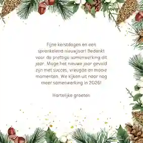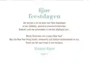 Een kerstkaart is niet compleet zonder een passende kerst- of nieuwjaarswens. Denk aan een dankwoord, een vooruitblik of een warme felicitatie voor het nieuwe jaar. De meeste kaarten bevatten al een voorbeeldtekst die je makkelijk kunt aanpassen. Op zoek naar nog meer ideeën? Neem dan een kijkje op onze inspiratie-omgeving voor zakelijke kerstkaarten.